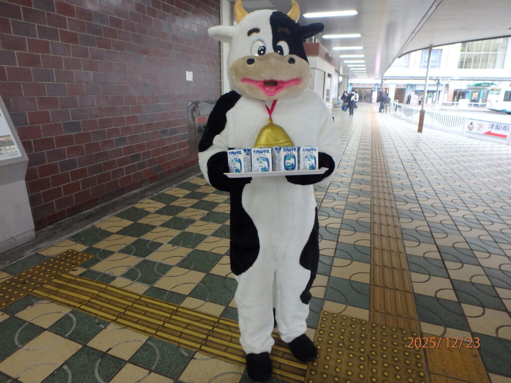 令和7年12月23日(火)に津駅東口で三重県農林水産部と一緒に津駅を利用・通行する方々を対象に県内産牛乳と牛乳に関するチラシやグッズを配布し、消費拡大キャンペーンを行いました。