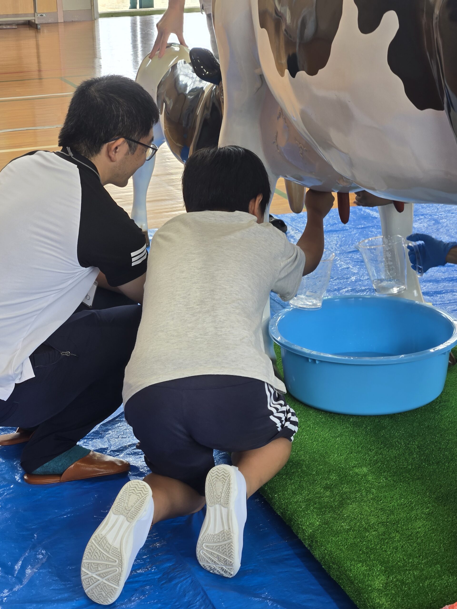 小学生1年生・5年生を対象に①模擬牛親子を使い、搾乳体験②牧場についての話③牛乳ができるまでの話④牛乳の飲み比べ